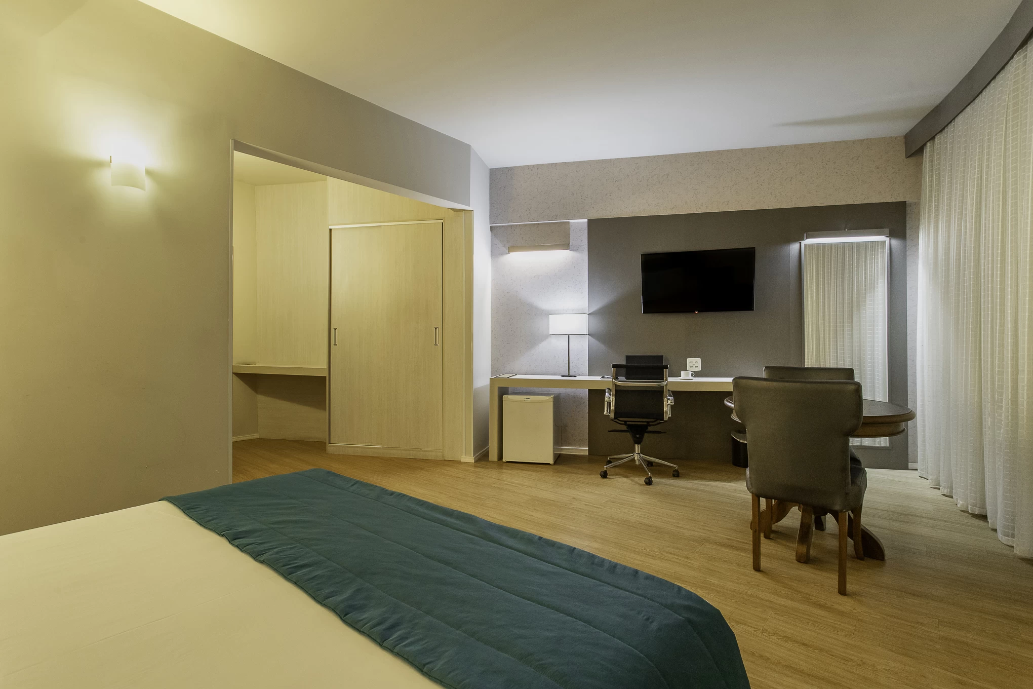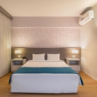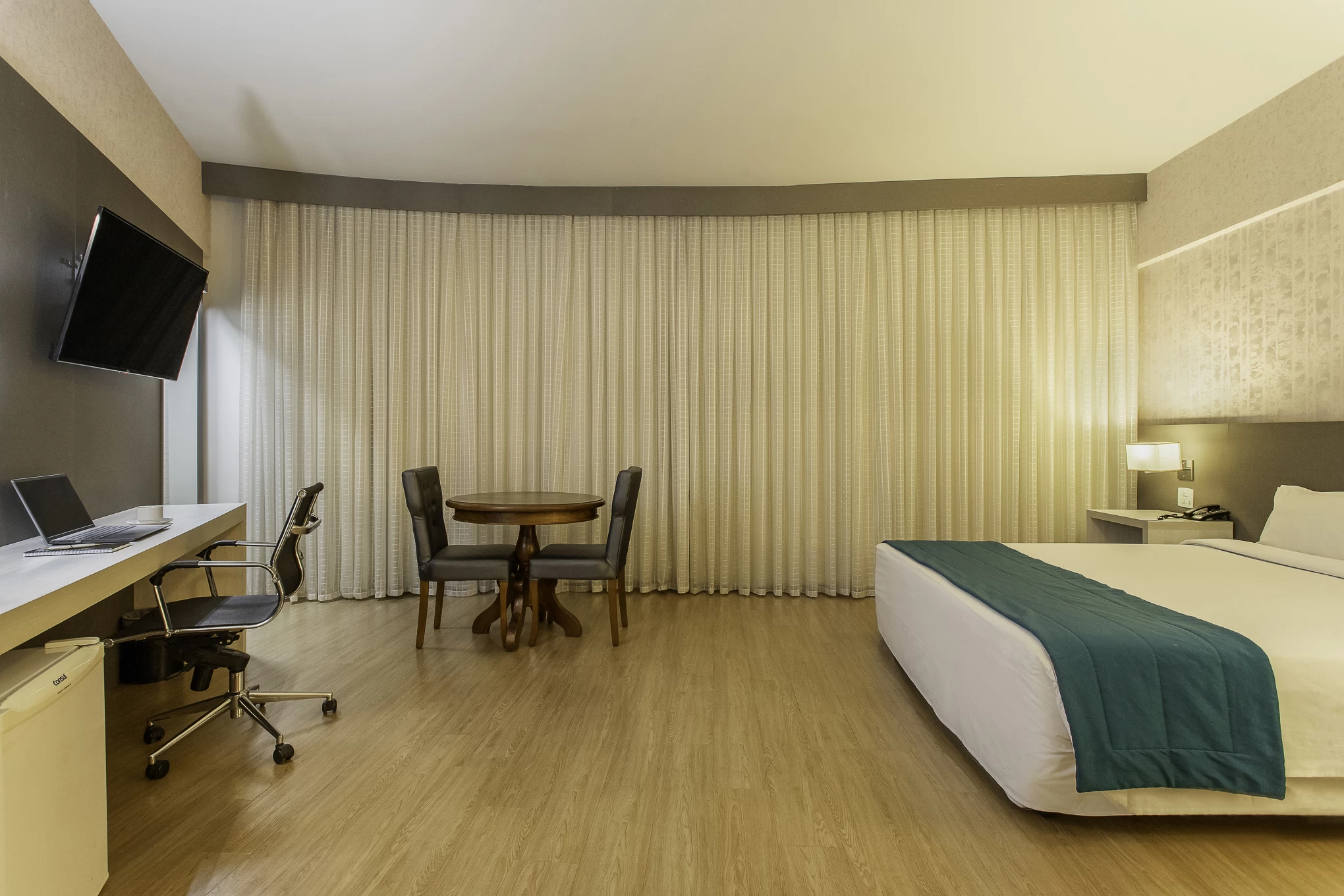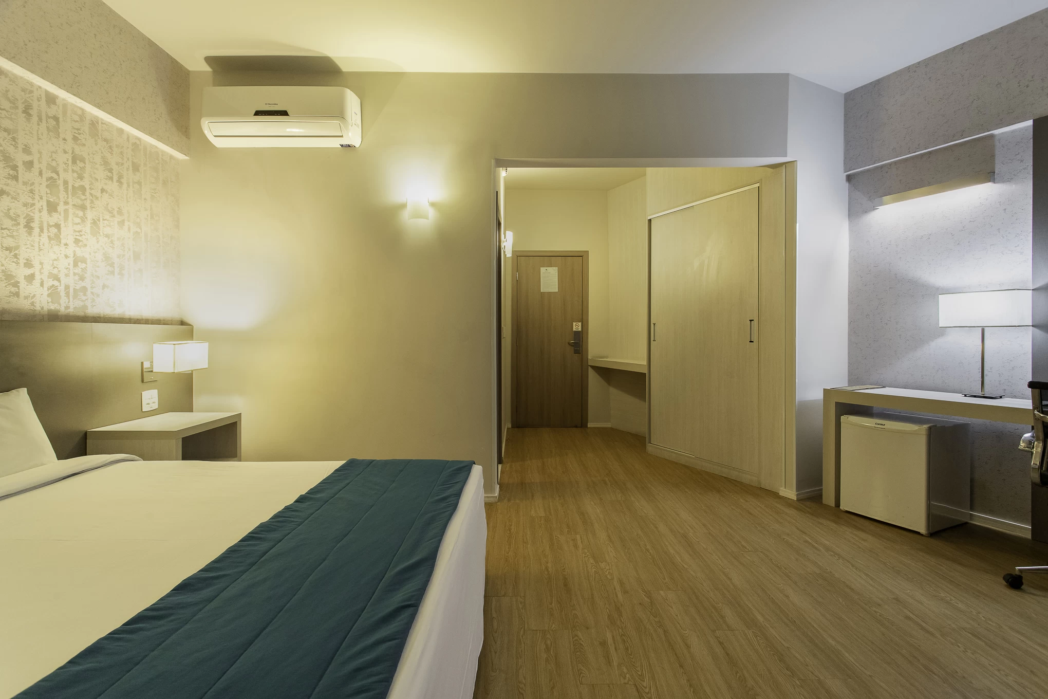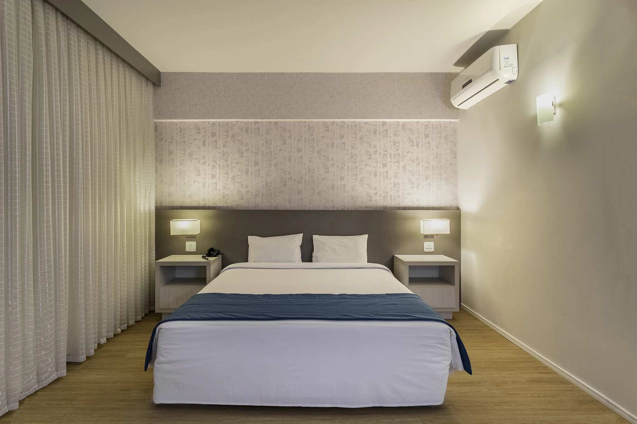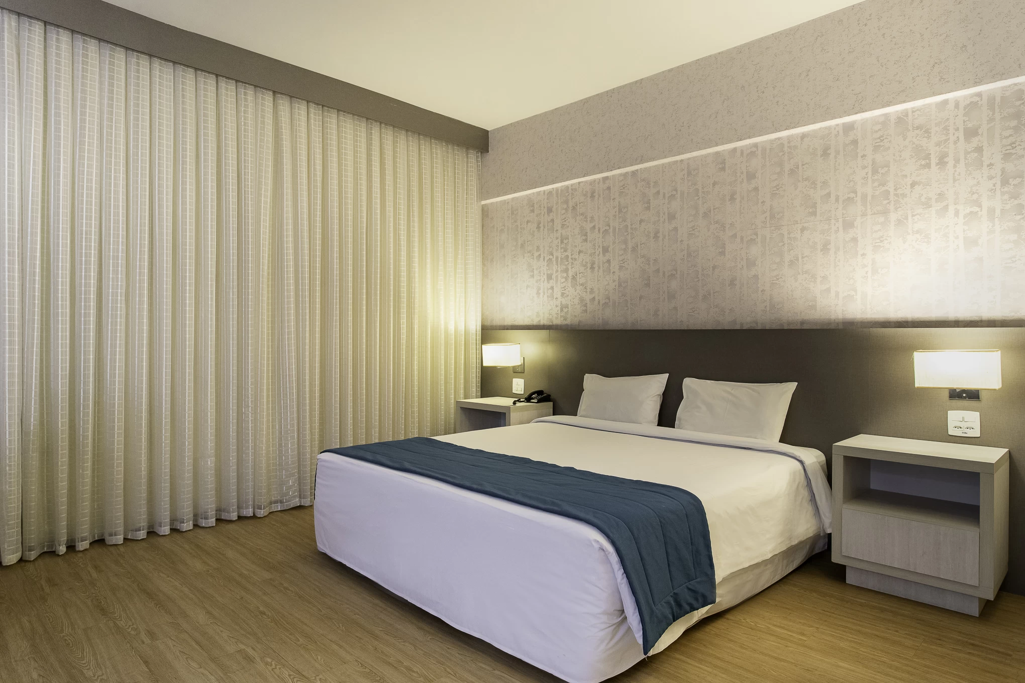 Cama king size, decoração acolhedora, detalhes sofisticados e elegantes.